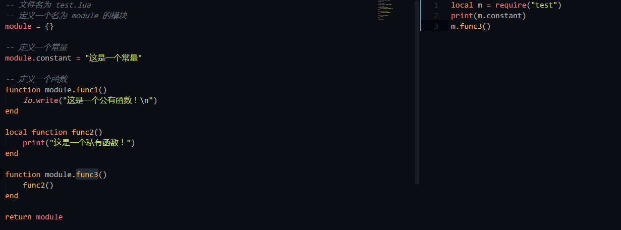 -- 文件名为 test.lua -- 定义一个名为 module 的模块 module = {} -- 定义一个常量 module.constant = "这是一个常量" -- 定义一个函数 function module.func1() io.write("这是一个公有函数!\n") end local function func2() print("这是一个私有函数!") end function module.func3() func2() end return module