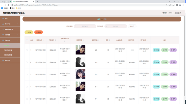 此页面让管理员管理囚犯的数据,囚犯管理页面见下图。此页面主要实现囚犯的增加、修改、删除、查看的功能。