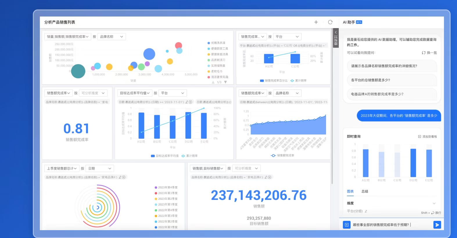 - 提供100+预置模板(如销售漏斗、库存预警、用户画像),支持一键套用。