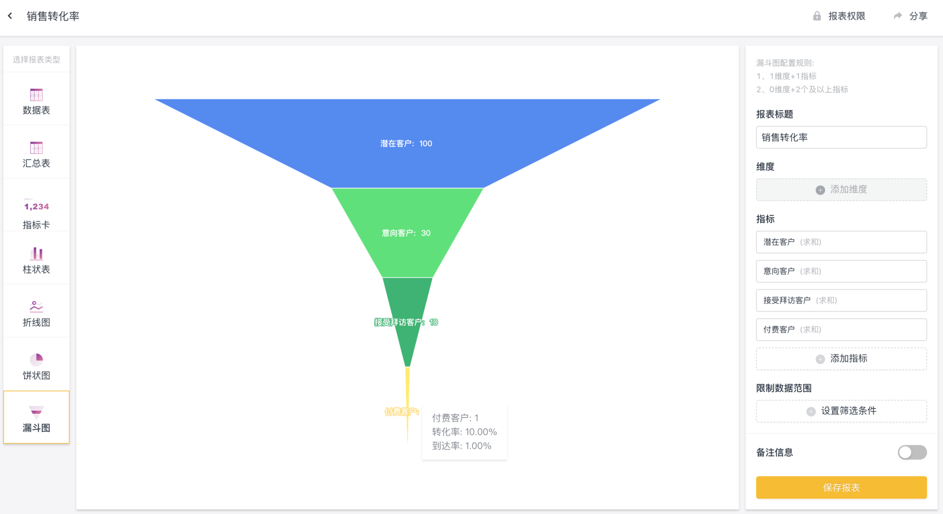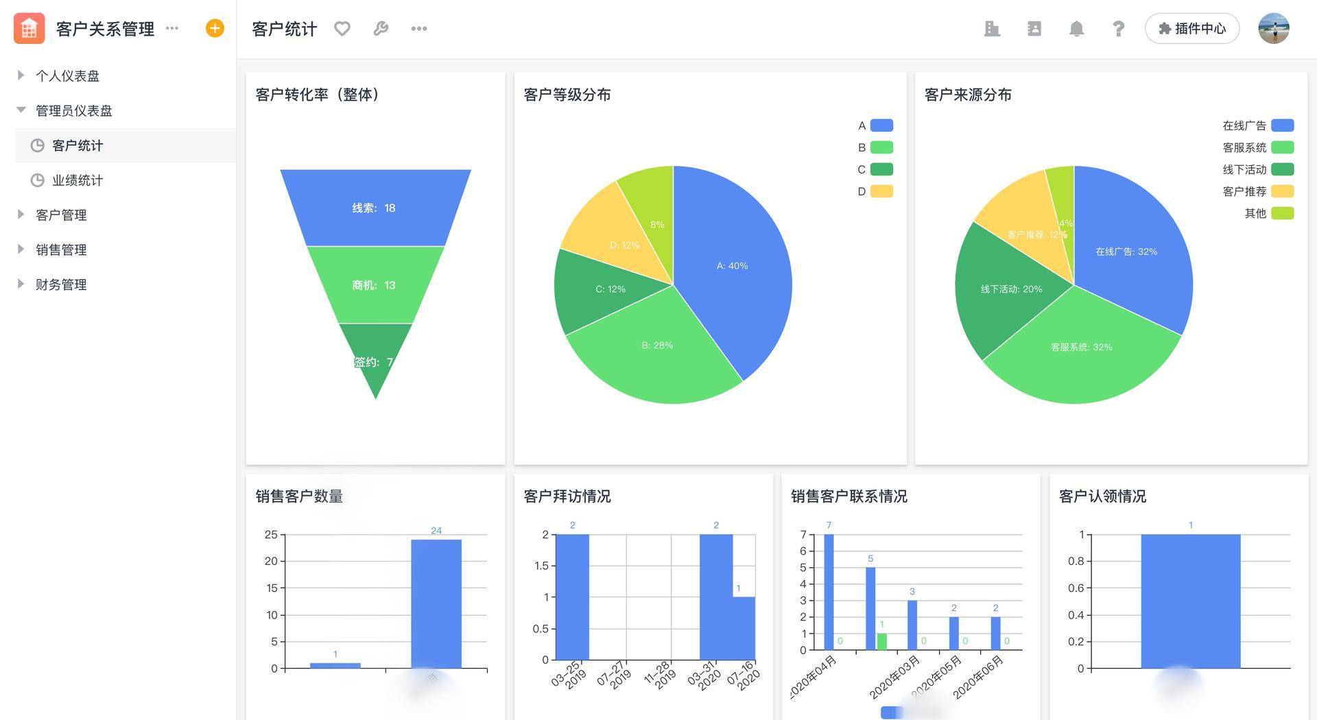 无论是客户等级分布,还是客户来源分布,抑或是客户转化率,都可以通过相关的数据报表进行呈现。通过报表分析,我们可以清楚地知道自己的客户跟进和转化情况,让每一个销售决策都有数据可依。