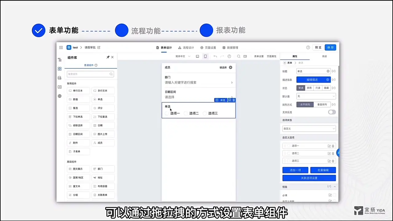 表单是宜搭中最基础也是最重要的功能之一。它允许用户通过简单的拖拽操作,快速构建各种类型的数据采集表单。无论是员工请假申请、采购订单填写,还是客户信息登记,都可以通过表单来完成。