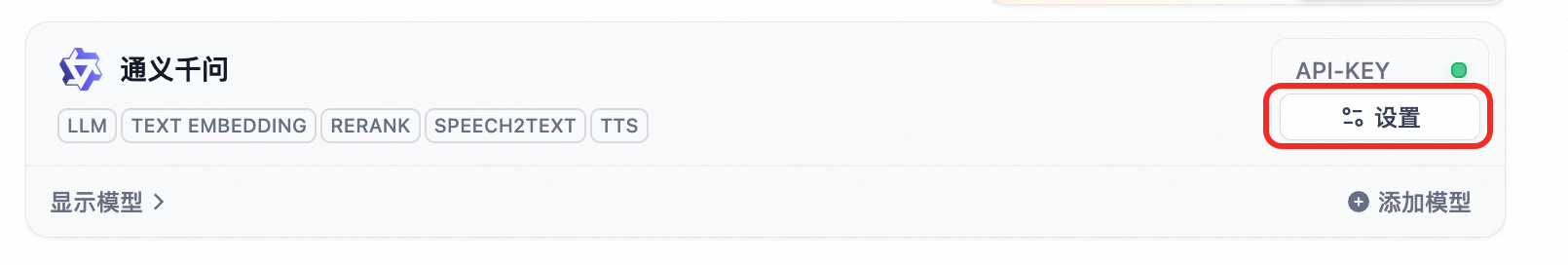 模型安装成功后,选择设置API-KEY,将提前准备好的百炼平台API-KEY 输入。