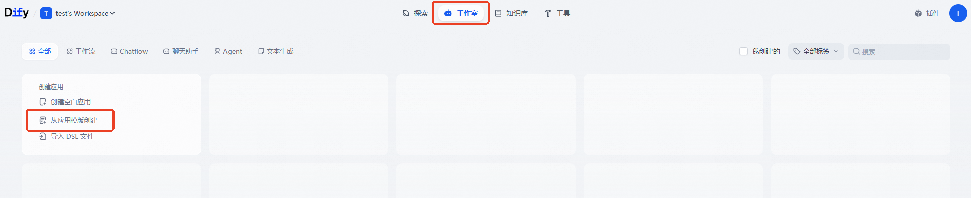 单击上方工作室回到首页,选择从应用模板中创建。