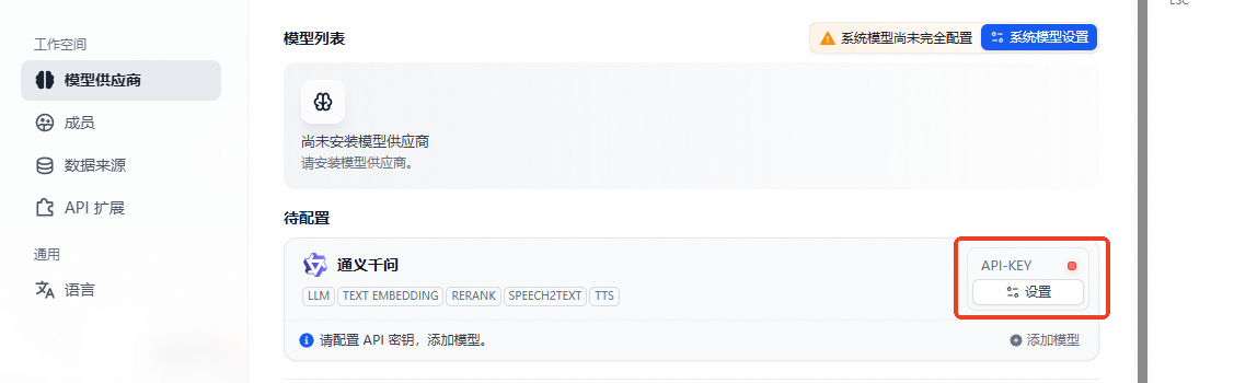 在设置--模型提供商处安装模型供应商,在这里我们选用了通义千问的模型,可以在百炼平台获取API-KEY。安装后,将API-KEY输入,验证绿灯即可。