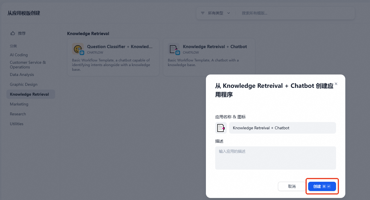 左侧菜单中选择Knowledge Retrieval,使用knowledge Retreival + Chatbot模板。