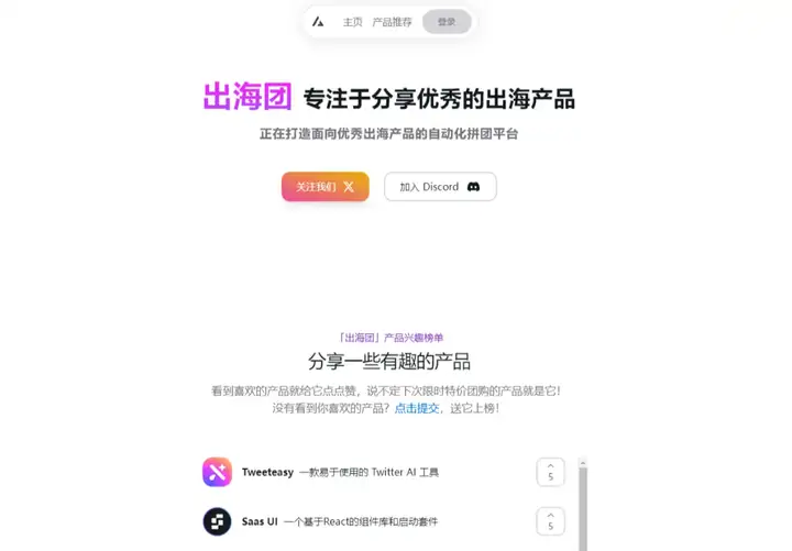 「出海团」主要是通过拼团活动进行的,计划面向全球市场,也在打造自己的「出海团」自动化拼团产品 和「出海团」社区,所以「出海团」不完全是互联网产品,更多是半产品半社区的融合体,也计划着自动化拼团平台的优质拼团服务 和 为更多产品创始人或独立开发者提供更多帮助和机会的双向出海社区。