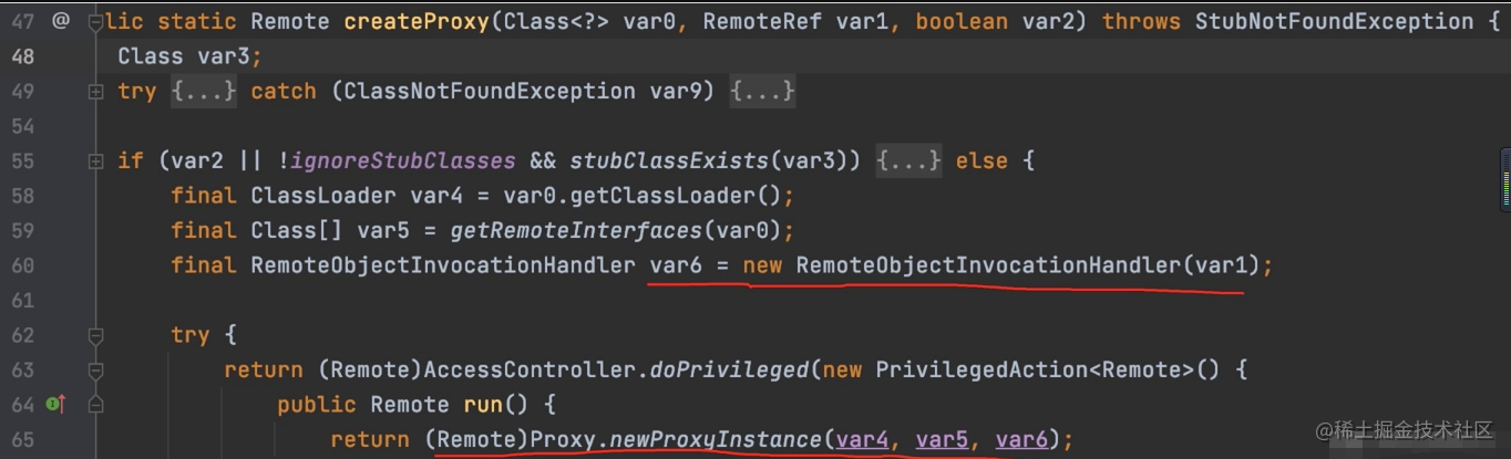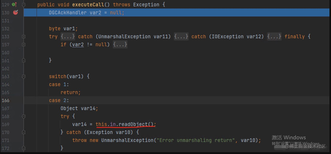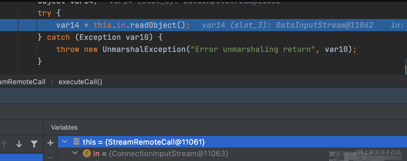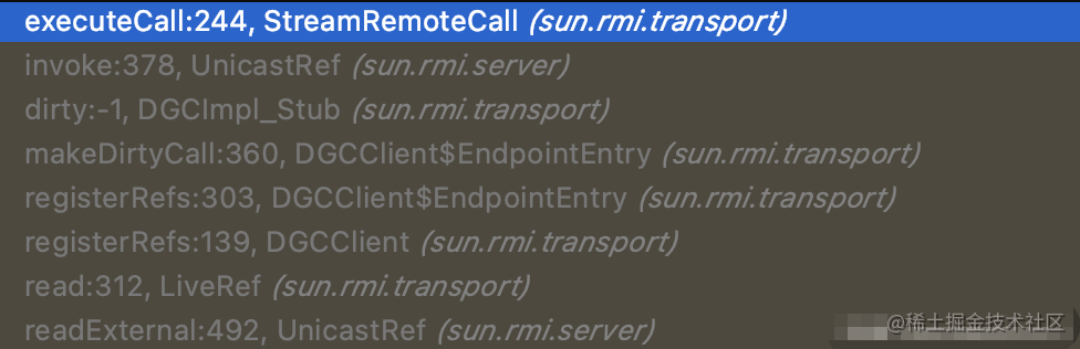 碰巧的是在RemoteObjectInvocationHandler的反序列化代码里会调用这个StreamRemoteCall类里的executeCall方法