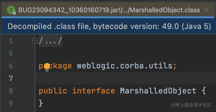 从报错中清楚的了解到MarshalledObject是不可被反序列化的。反过头来看下补丁是如何修补的。头脑简单的笔者一开始认为这次又是添加了什么白名单,就在各种blacklist中疯狂寻找,无果,郁闷了半天。突然在使用idea分析时在补丁包中发现了一个MarshalledObject.class文件,如下所示