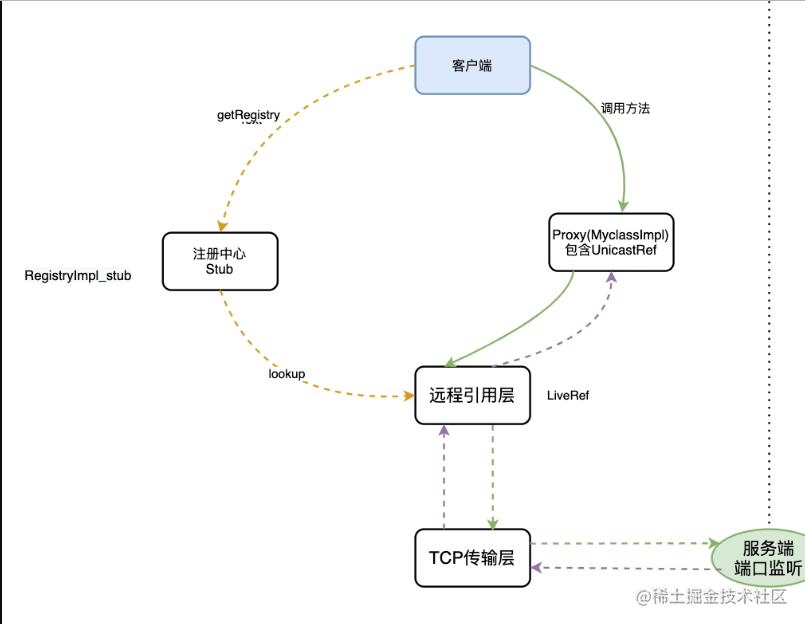- 紫线:服务端接收到lookup请求后,会将已经生成好的**代理类Proxy(MyclassImpl)**返回给客户端