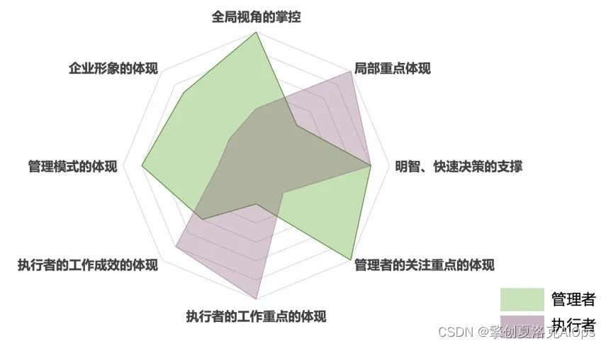 - 另一方面体现在执行层。执行者希望能够从海量数据抽丝剥茧,找到有执行价值的数据,通过自下而上的视角,把执行成果进行呈现,恰好对应上管理者的决策。