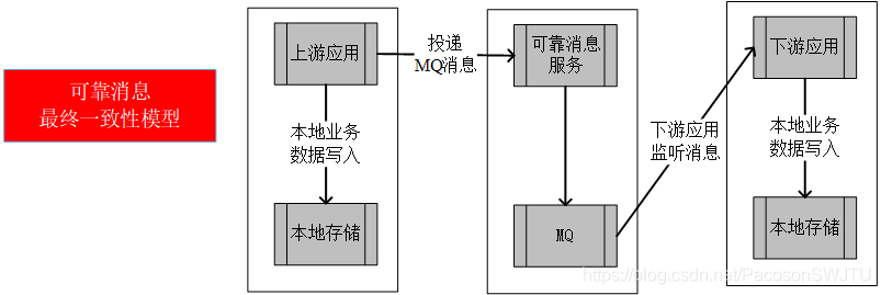 通过消息确认和消息重发两个功能,可以确保上游应用、可靠消息服务和下游应用数据的最终一致性。(补充——消息确认保证了上游应用成功执行业务,消息重发保证了下游应用成功消费数据)