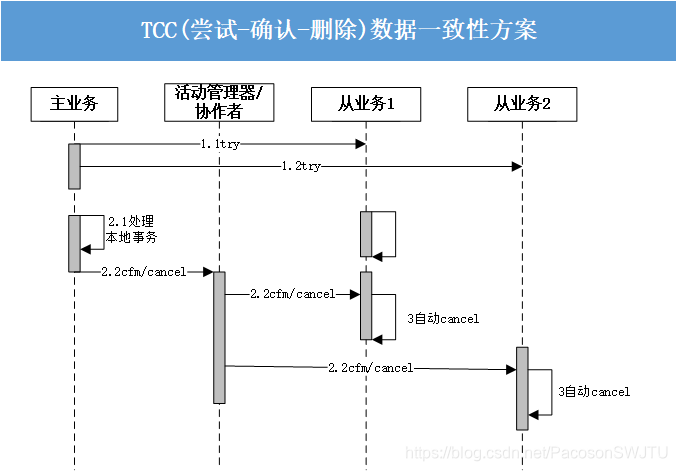 第二阶段:活动管理器根据第一阶段从业务服务的 try 结果来执行 confirm 或 cancel 操作。如果第一阶段所有从业务服务都 try 成功,则协作者调用所有从业务服务的 confirm 操作,否则,调用所有从业务服务的 cancel 操作。