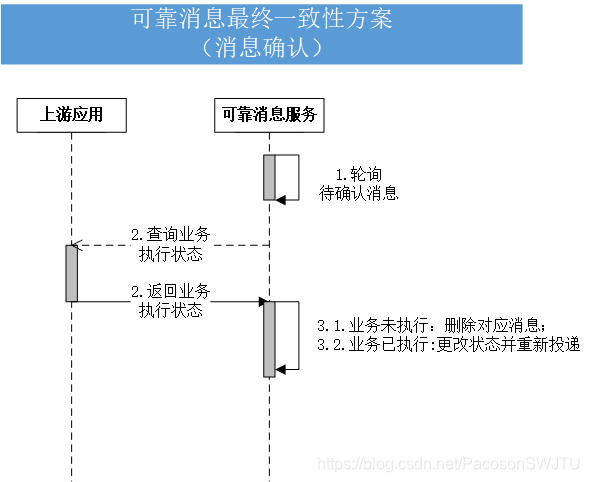 可靠消息则携带消息体内的信息向上游应用发起请求查询该业务是否已执行。上游应用提供一个可查询接口供可靠消息追溯业务执行状态,如果业务执行成功则更改消息状态为已发送,否则删除此消息确保数据一致。具体流程如下: