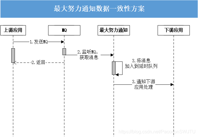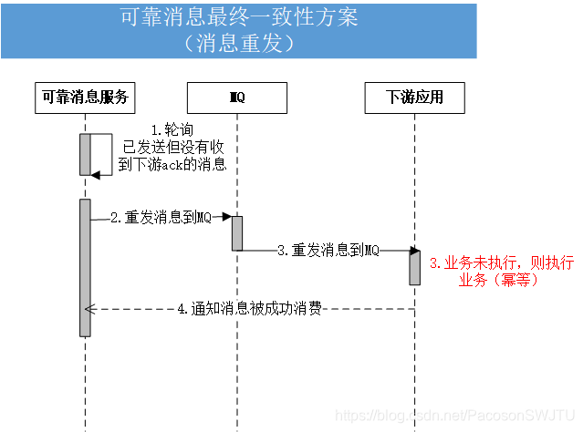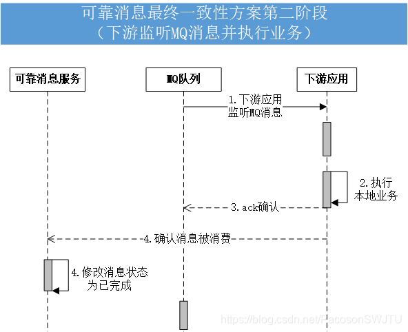 下游应用监听到此消息后,在保证幂等性的情况下重新执行业务并通知可靠消息服务此消息已经成功消费,最终确保上游应用、下游应用的数据最终一致性。具体流程如下: