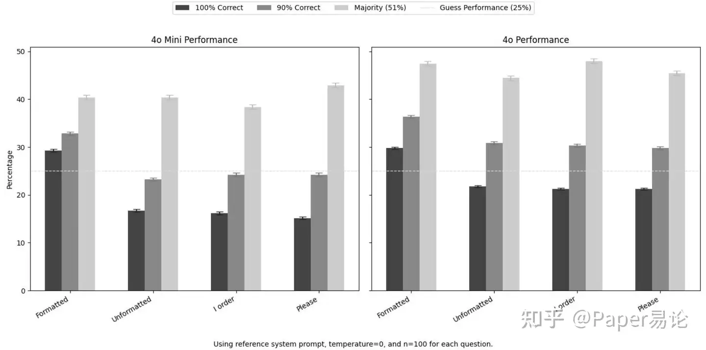 在我们的案例中,我们发现使用未格式化提示,GPT-40(RD = 0.086; 95% CI [0.040, 0.136]; p < 0.001)和GPT-40 mini(RD = 0.121; 95% CI [0.056, 0.187]; p < 0.001)的模型性能显著下降。我们没有发现任何证据表明基本提示工程在三种条件之间产生显著效果,除了40 mini在51%阈值时的“我命令”与“请”(见补充表1)。