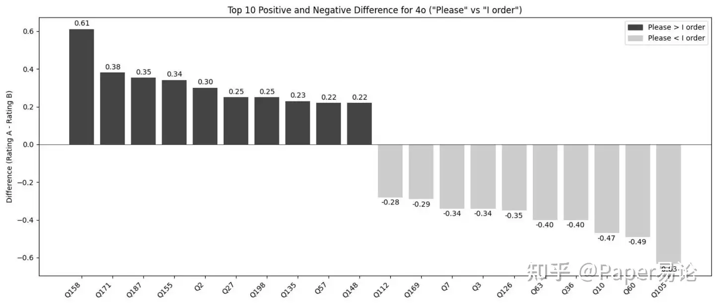 图2:GPT-4o在“请”和“我命令”条件下的前10个表现差异。所有差异均高度显著()且未校正。补充表3包含置信区间和统计信息。