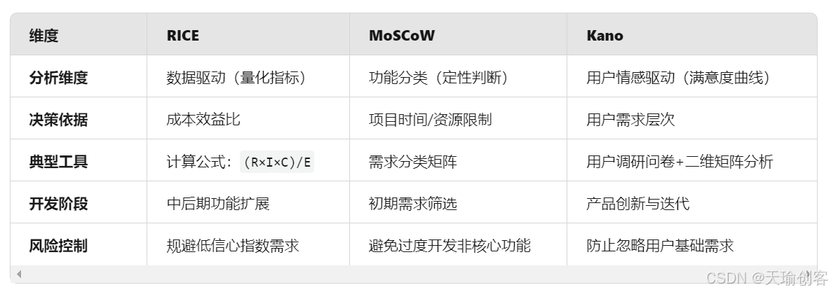 RICE/MoSCoW/Kano三种产品路线的差异分析