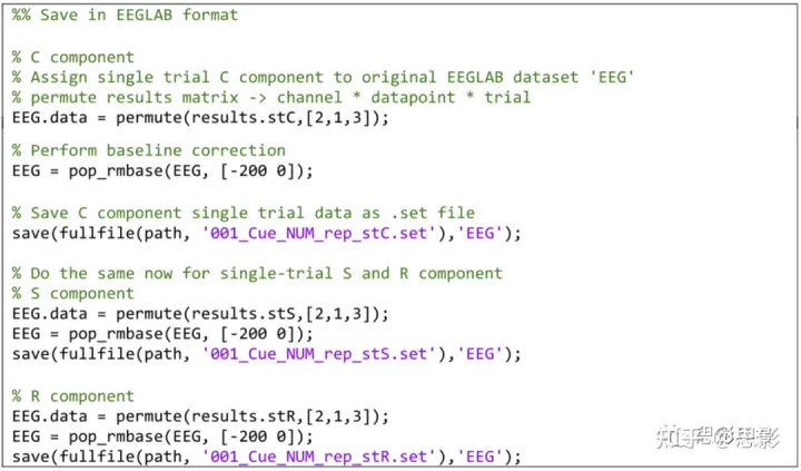 提示:在下面的例子中,将C成分数据矩阵移回原始的EEG变量中,并将变量保存为EEGLAB.set文件。