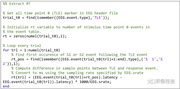 强调:在EEGLAB中,单个试次在“EEG.event.type”中以“TLE”编码。该脚本可查找该反应首次出现时的反应类型(例如,左键是“S1”、右键“S2”)。基于试次的RTs是使用特定TLE事件和响应事件之间的数据点数量来计算。