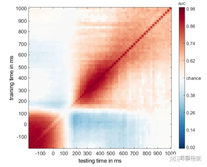 时间泛化分析是将组水平分析应用于整个测试训练时间点矩阵上。其功能是测试分类器是否适用于其他时间点上的表现。