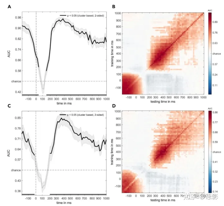 C成分信号分类展示了一个明显可释的结果(图1)。图1B和1D的对角线上显示出较高分类精度的时段,也就是对角线解码中显著高于机遇水平的时段(图1A和1C)。对于不同时间泛化模式的解释,推荐参考King和Dehaene(2014)。当然,分类表现不仅可以高于机遇水平,也可以低于机遇水平。图2就展示了这种可能性。