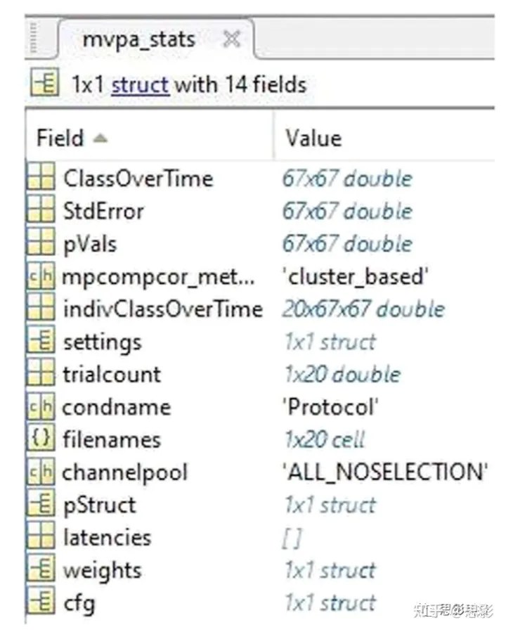 6.指定训练和测试的时间维度。设置“cfg.reduce_dims”参数指定我们想要分析的时间点矩阵。教程设置为'diag'。因此,组水平解码使用的是训练集逐时间点解码该时间点下测试集的表现(即,测试*训练时间点矩阵的对角线)。结果保存在名为“mvpa_stats”的结构数组类型变量中(详见预期结果部分)。