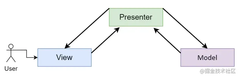 - Presenter:中介,负责完成View与Model间的交互和业务逻辑。