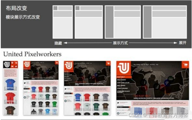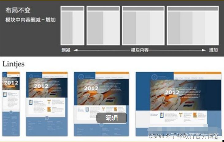 布局响应:对页面进行响应式的设计实现,需要对相同内容进行不同宽度的布局设计,有两种方式:pc优先(从pc端开始向下设计);移动优先(从移动端向上设计);•无论基于那种模式的设计,要兼容所有设备,布局响应时不可避免地需要对模块布局做一些变化(发生布局改变的临界点称之为断点),