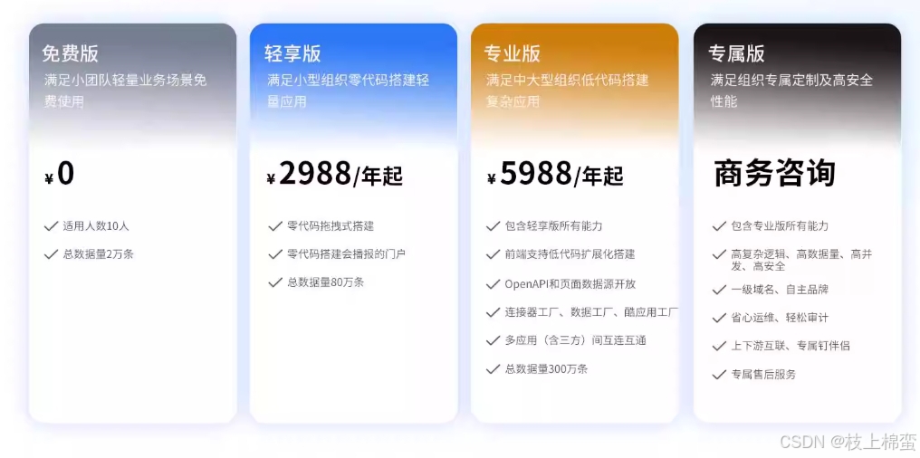 轻量级免费版:支持10人团队使用,含基础表单、审批流及20GB附件存储,但限制总数据量2万条、流程数10个210。
