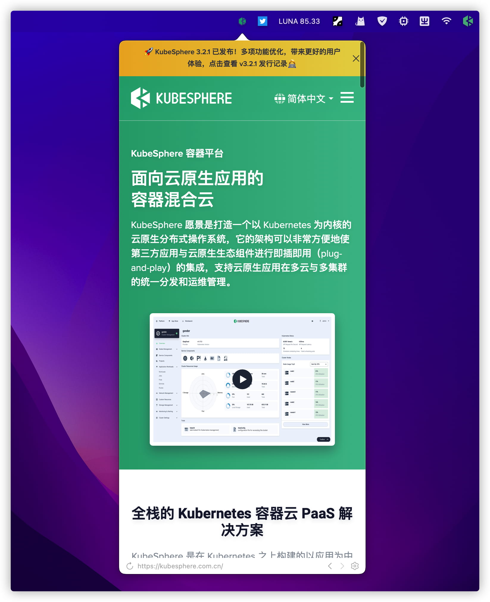 MenubarX 是一款强大的 Mac 菜单栏浏览器,可以在菜单栏固定任何网页,就像原生 App 一样使用,支持调整窗口大小。以 KubeSphere 官网为例: