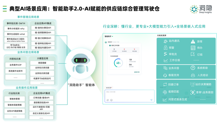 洞隐智能助手通过事件管理、业务问答和业务操作集成等应用场景,为用户打造AI赋能的供应链综合管理驾驶舱。对供应链可视化的综合事件管理,如:工作日报、待办、预警、异常、通讯、信息订阅、风险提醒等强化供应链协同和监控;引入AI大模型,构建不同场景的智能体和知识库,支持知识问答场景应用;集成供应链各环节的系统API和AI应用工具,实现AI业务场景应用闭环。