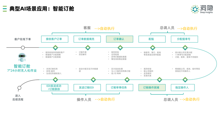 货代企业运营中的订舱流程在人工操作下数据映射量大,容易出错;放舱时间和国际物流跟踪更是存在很多不确定性,耗时耗力。洞隐智能订舱的应用能够很大程度上解决这些问题。智能订舱利用AI分析业务规则,提供决策建议,构建自动化任务,并检验业务规则的准确度。