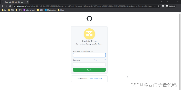点击按钮“Continue with Auth0”,西门子低代码就会执行OauthWithGithub模块中的微流“Open_ LoginPage”,访问Github用户登录页面(建议使用无痕模式访问应用,测试效果更佳)