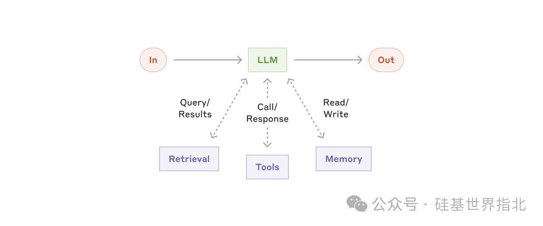 定义:类Agent系统最基础的模块是"增强的LLM",即具备检索、工具使用和记忆等功能的语言模型。Anthropic当前的模型能够主动使用这些功能——生成搜索查询、选择合适工具以及确定需要记忆的信息。