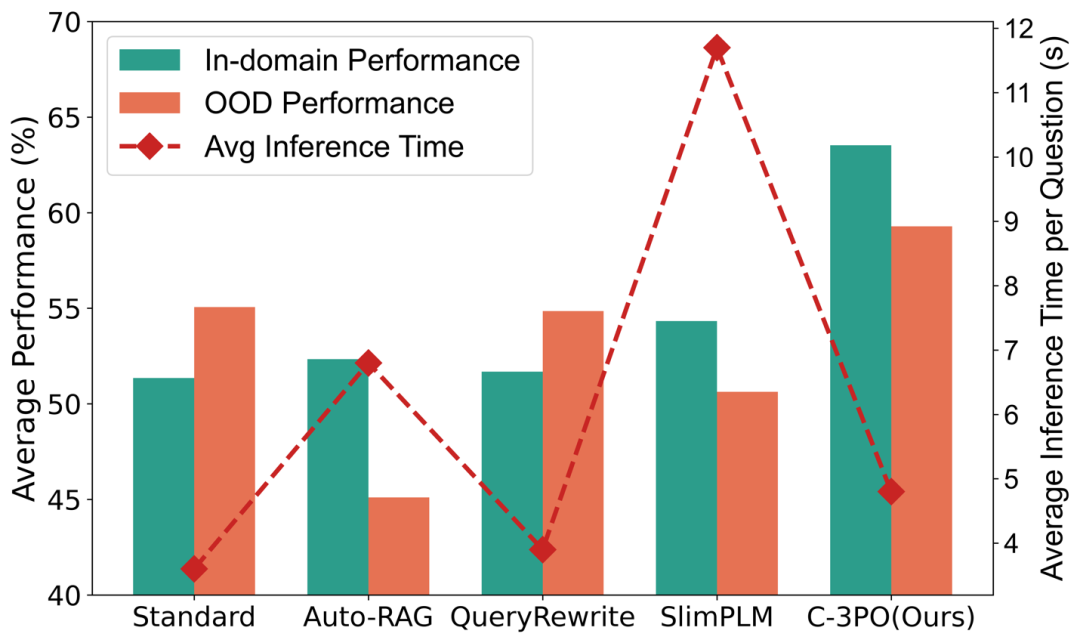 该工作从各个角度全面评估了C-3PO的性能,包括域内的单跳、多跳数据集(图2),域外最新的RAG评测数据集以及域外检索器和大模型上的性能(图3)。总体而言,仅优化少量参数(0.5B-1.5B)的情况下,C-3PO在各种单跳和多跳数据集上表现出出色的性能。而在各种域外设定下,C-3PO取得了非常鲁棒的结果,展现出其即插即用的特点。