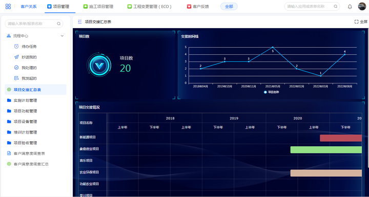这是一个低代码平台搭建的项目施工管理模板,总共包含了实施计划管理、项目功能管理、项目设备管理、培训计划管理、项目验收管理、客户满意度调查模块。