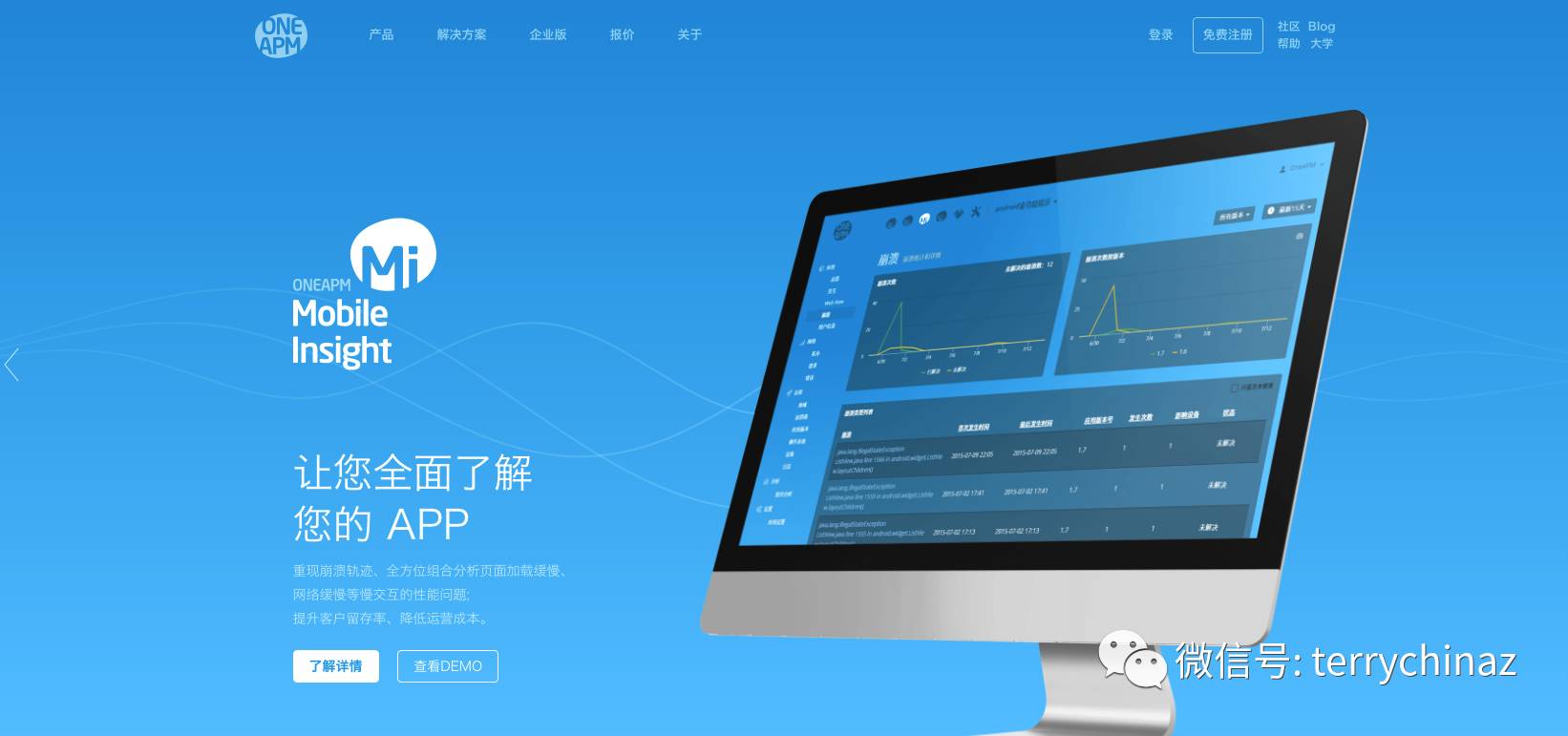 类似国外New Relic或国内听云,One APM可以选择性接入产品的网站,数据库,服务器。通过上报性能或日志数据,产生可视化的数据面板,不断改进产品。