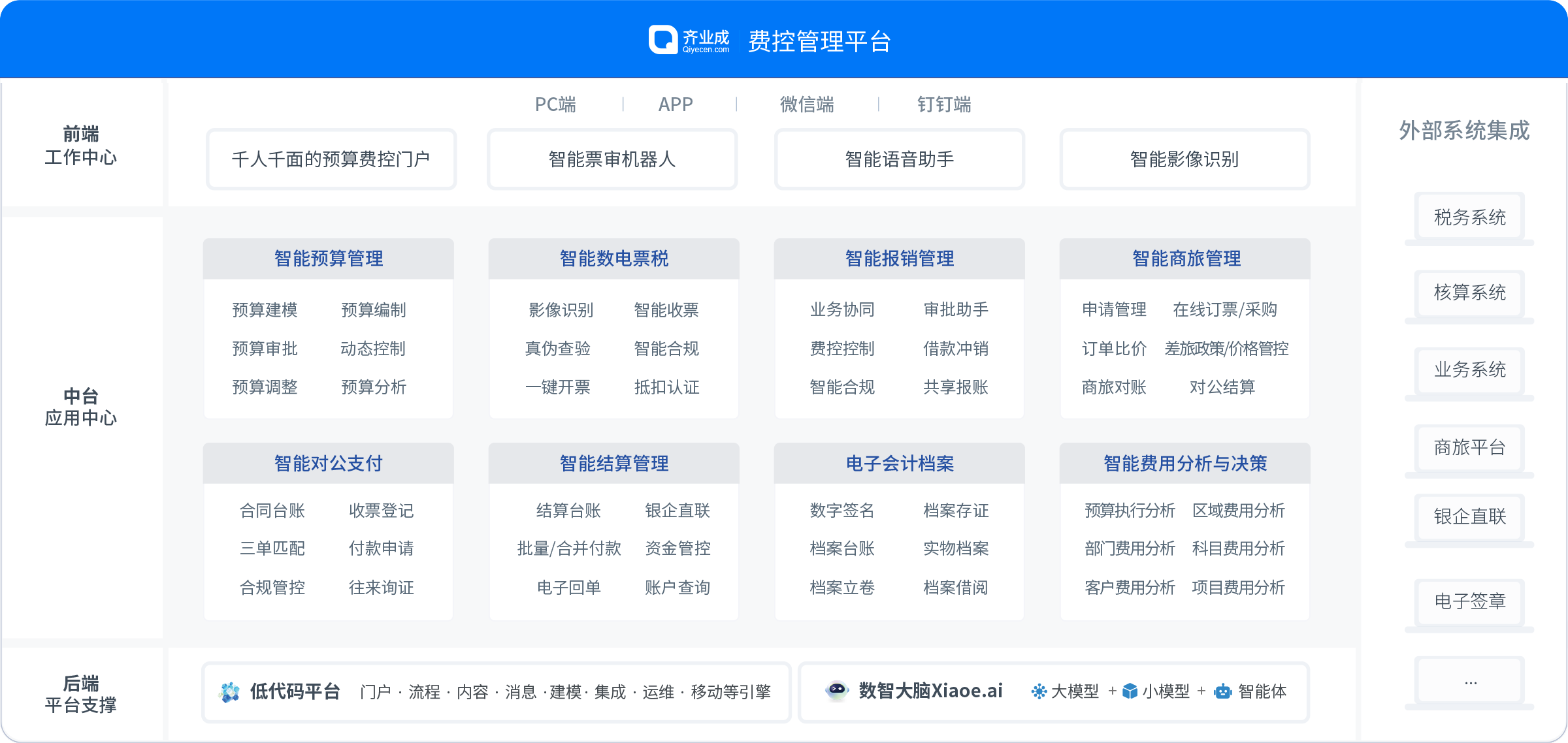 泛微·齐业成是泛微网络科技股份有限公司旗下专注于费控管理的专项品牌,拥有二十余年的预算费控领域经验,客户覆盖金融、制造、医疗等87个细分行业。其通过泛微低代码平台、电子签章及智能引擎技术,构建了“预算编制-费用申请-发票归集-智能报销-银企支付-电子归档”的全流程闭环管理体系,支持集团化管控、多业态协同及信创适配,助力企业实现合规透明、降本增效的费控目标。
