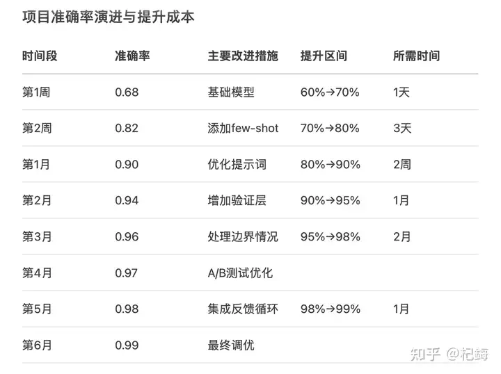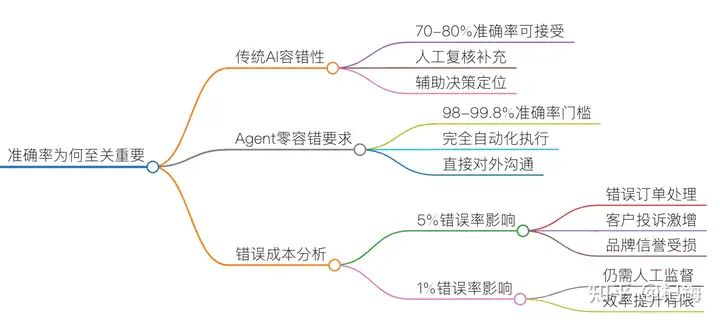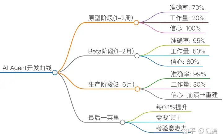 准确率的提升并非线性努力。从90%提升到95%可能需要2周,但从98%提升到99%可能需要2个月。这就是为什么许多AI Agent项目在原型阶段表现出色,却难以达到生产级标准的原因。