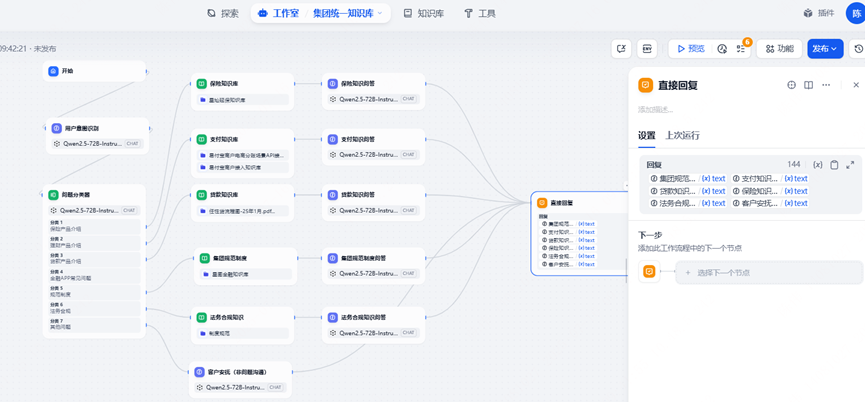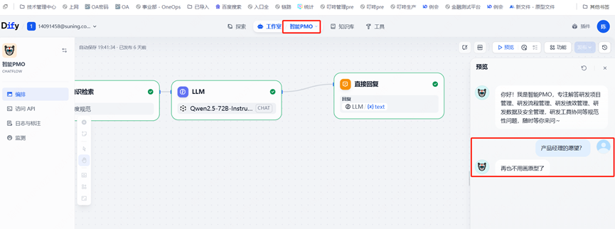 通过DIFY整合集团各类型知识(产品介绍、运维知识、管理规范、规章制度等),支持跨团队共享;查询耗时从5分钟缩短至≤1分钟(效率提升80%+),减少员工检索时间成本