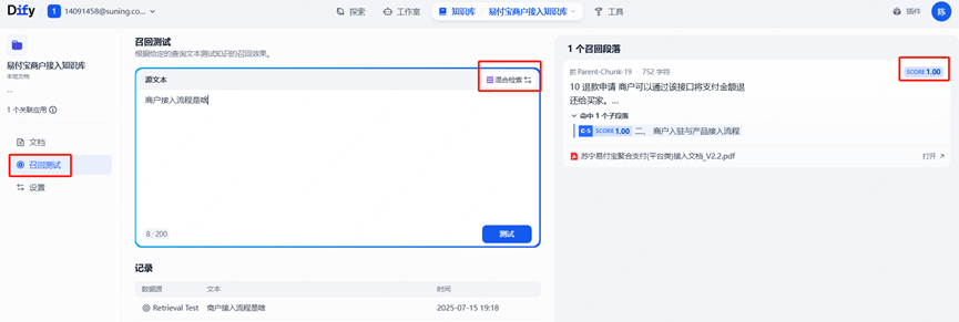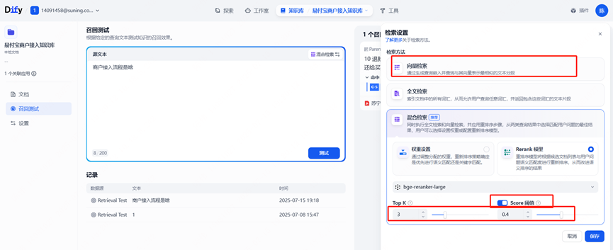(3)按知识类型调整精度参数,通过“知识库召回测试”动态调优