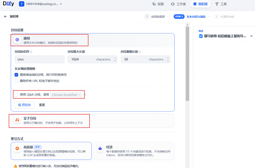 父子模式:是在通用模式基础上的一种升级,子分段匹配,父分段补充,适用于文档内容复杂,段落之间关联性强,用户问题需要上下文信息来辅助回答的场景,例如AI智能客服、解决方案文档等。