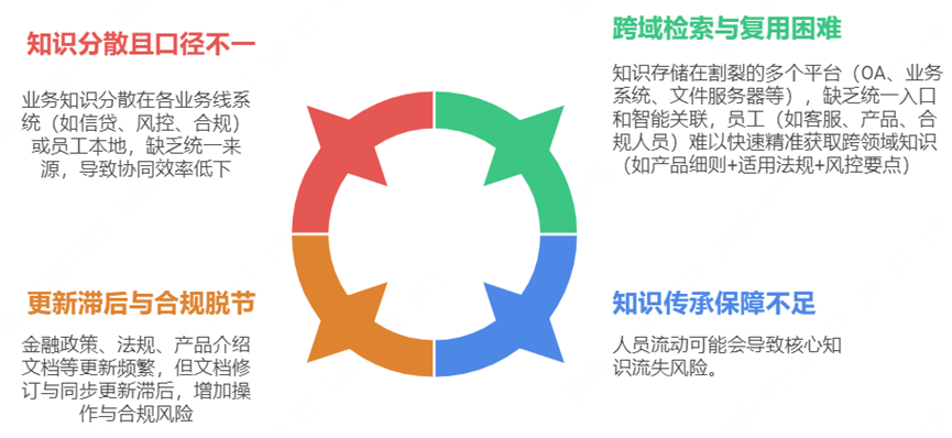 在企业数字化转型加速的背景下,大型金融机构由于组织架构复杂、业务条线多元(如理财、信贷、保险、科技等多条业务线)、合规监管严格,其知识管理面临更系统性的挑战: