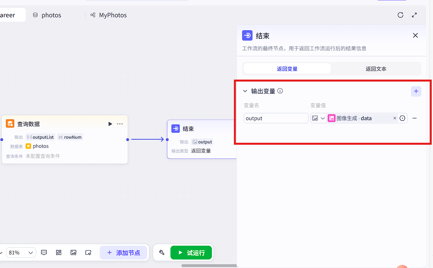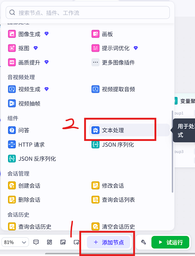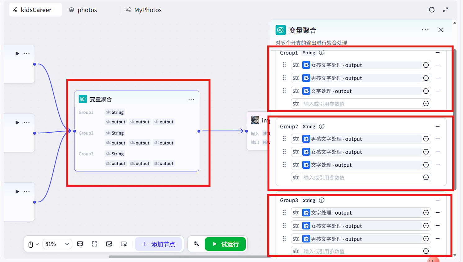再添加一个变量聚合节点,并将以上三个文本处理节点与变量聚合节点连接