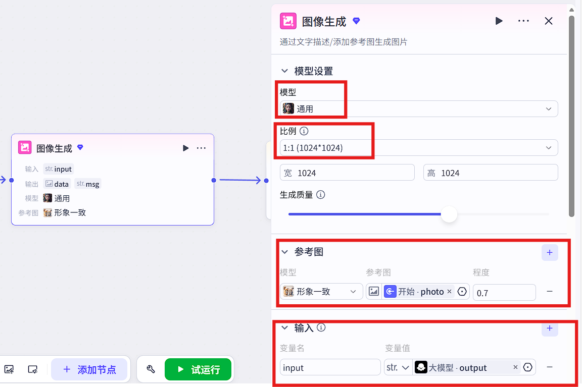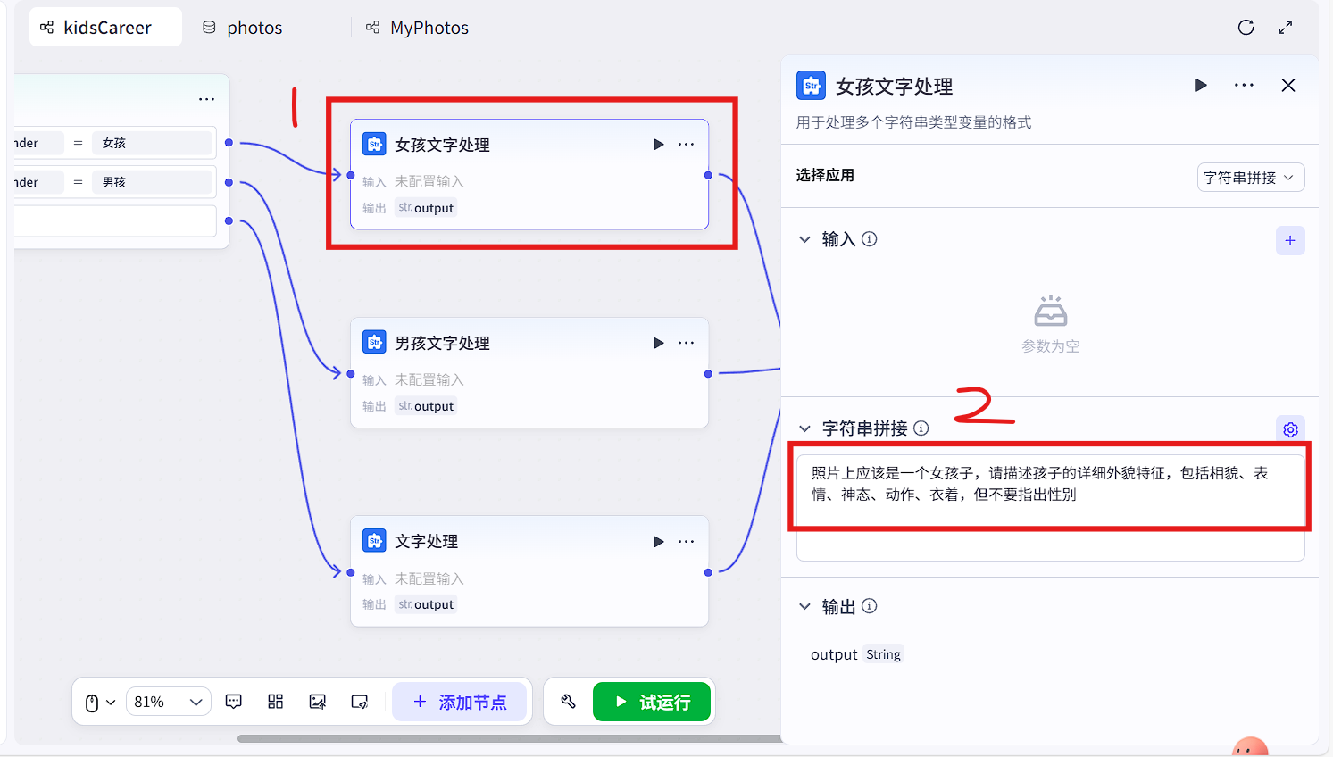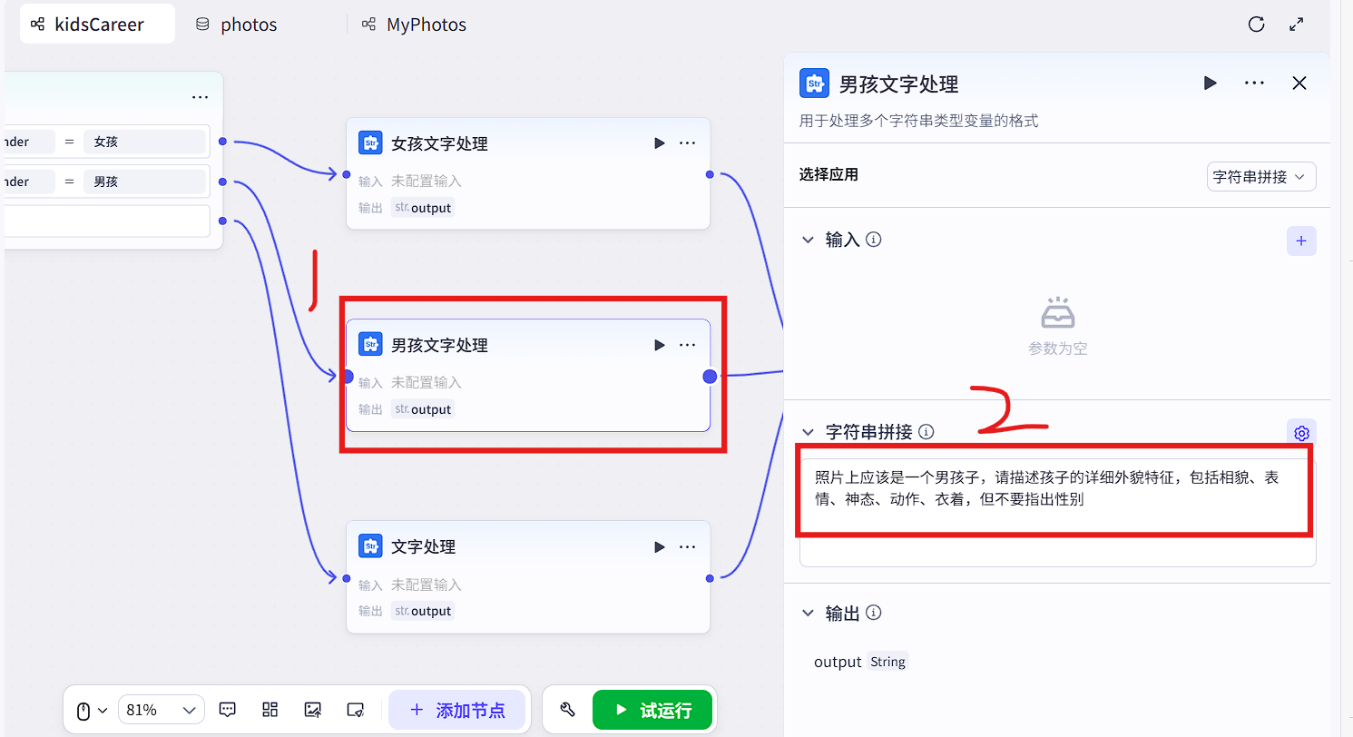 再添加一个变量聚合节点,并将以上三个文本处理节点与变量聚合节点连接