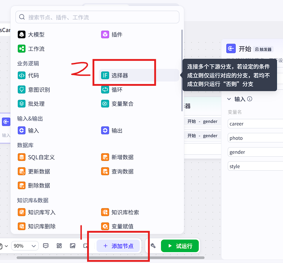 然后添加节点,选择IF选择器,连接开始节点和IF选择器节点