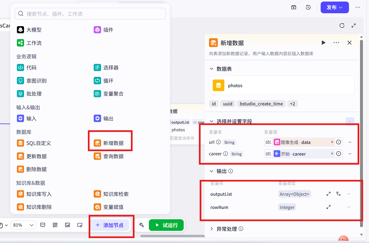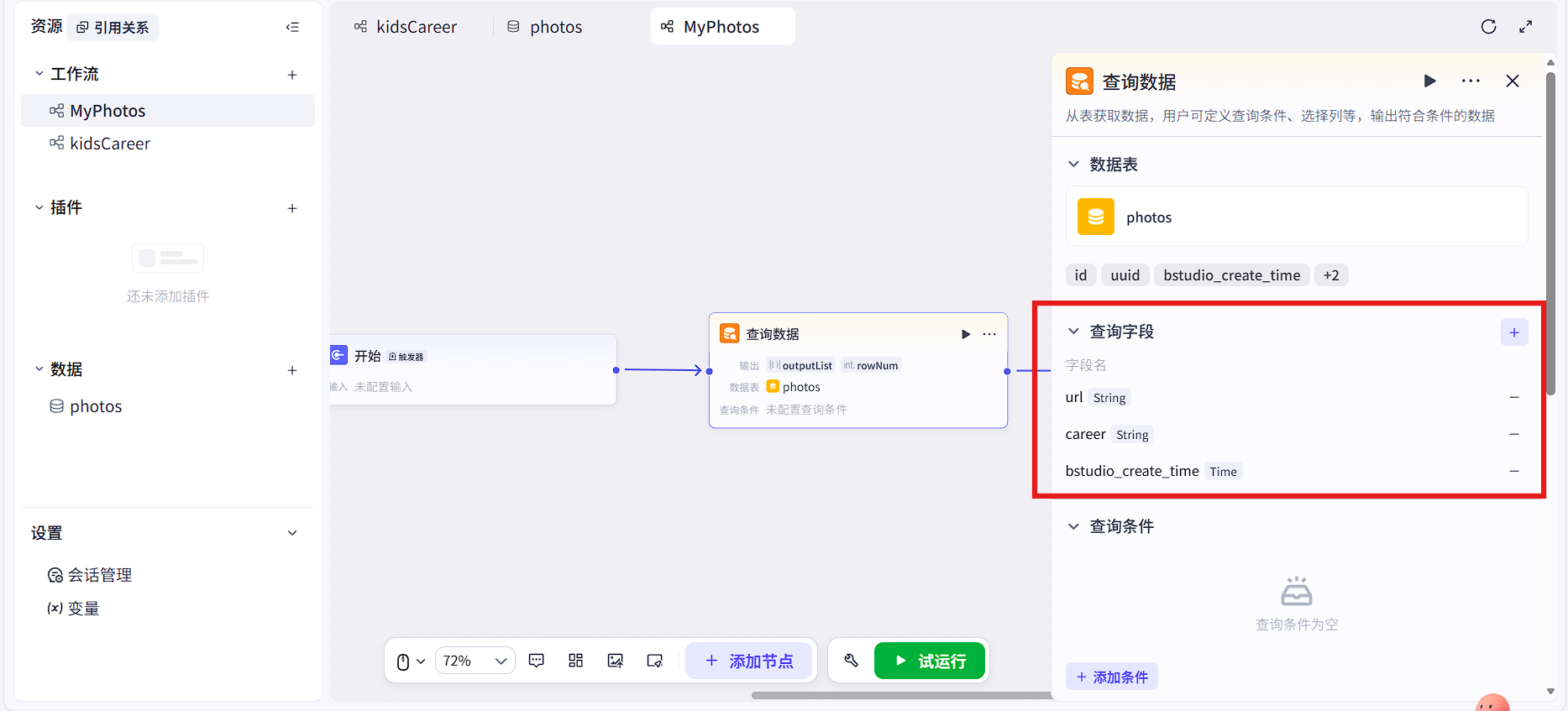 在 新增数据 节点后再添加一个 查询数据 节点,并进行图内配置