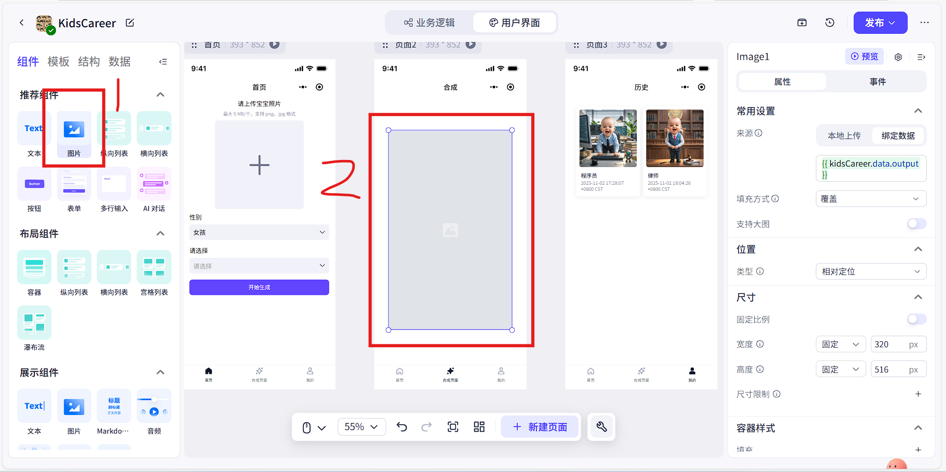 在人工智能与低代码技术飞速发展的今天,普通人也能快速构建功能强大的 AI 应用。本文将带你使用 Coze 平台,从零开始创建一个“宝宝职业合成”小程序——只需拖拽组件、配置逻辑,无需写一行代码,即可让家长上传宝宝照片,AI 自动生成孩子未来可能从事的职业形象(如程序员、律师等),并保存历史记录。