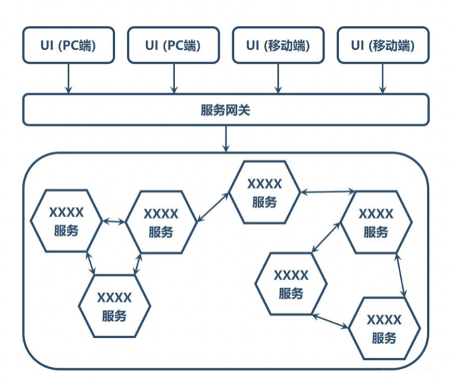 还是以ERP系统举例,系统里的商品,用户,订单,库存等不同的部分都成为了独立的微服务,每一个服务之间都可以进行直接的通信沟通。